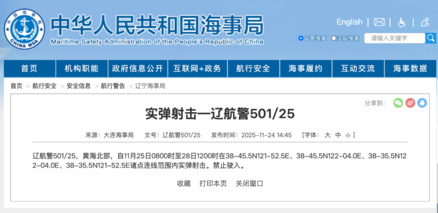 11月25日8时至28日12时,黄海北部部分海域实弹射击,禁止驶入。