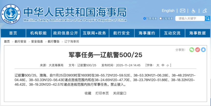 此前,大连海事局于11月21日发布航行警告,11月23日16时至12月7日16时,渤海海峡黄海北部部分水域范围内执行军事任务,禁止驶入。